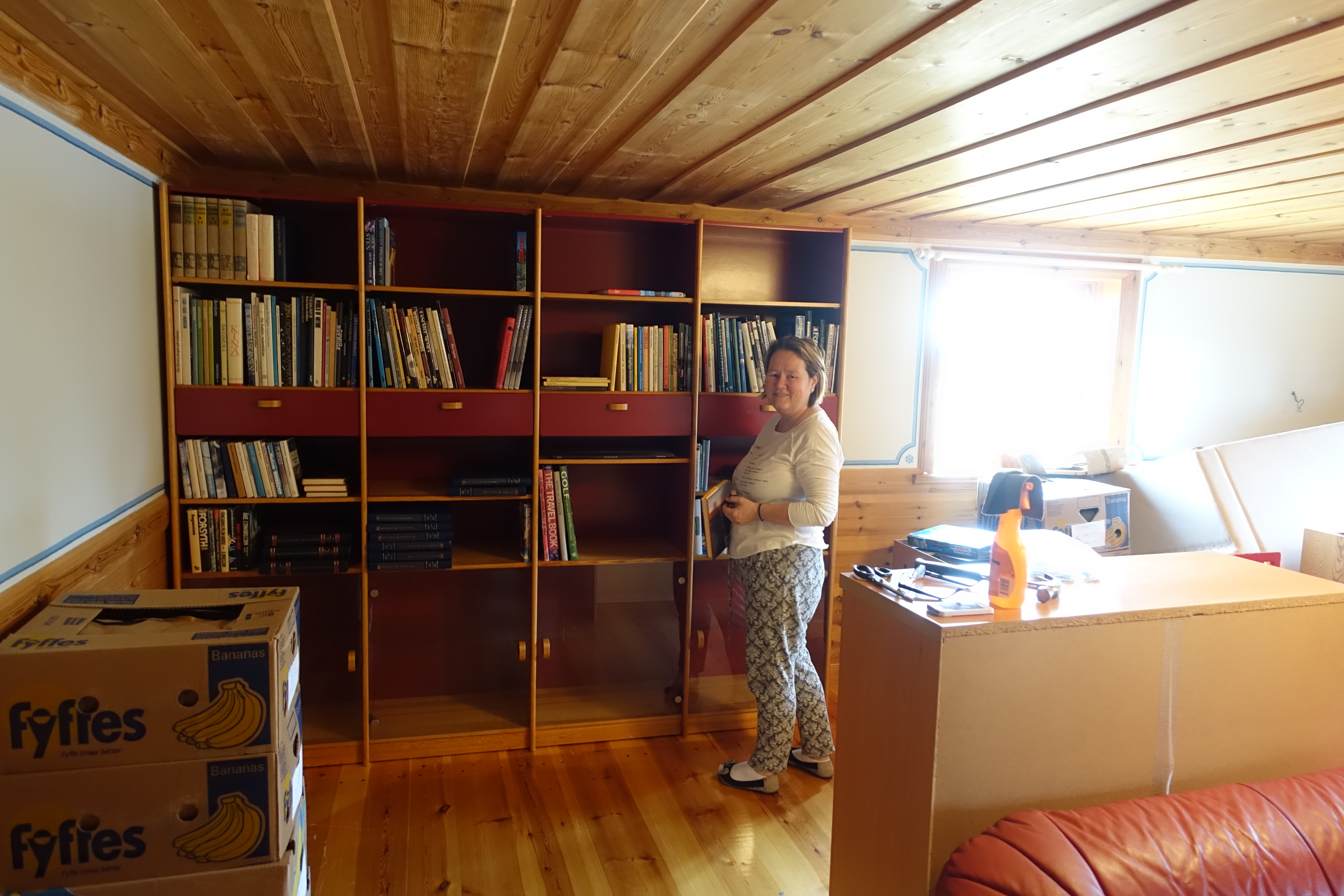 Vi har fokus på sovrummet idag och Uffe monterar dit våra gamla garderober från Kista. Först får han såga av dem inne i garaget då takhöjden är lägre än tidigare. Sen ska de på plats och alla gångjärn ska skruvas fast. Det är ett jobb som kräver tålamod och precision.
